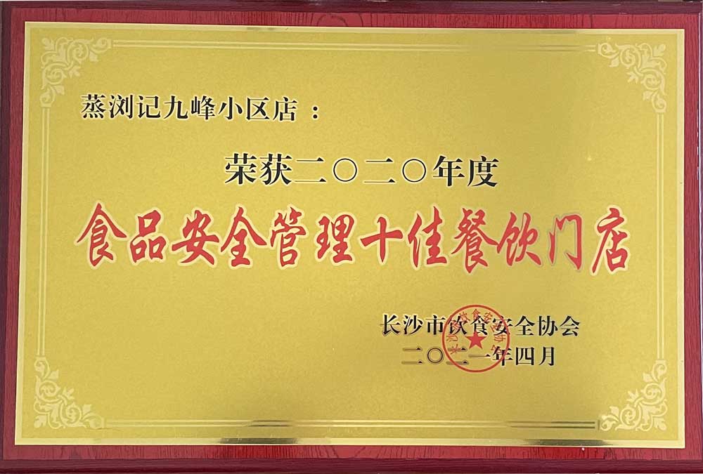 此次會議上,蒸瀏記九峰小區店獲評“2020年度長沙市食品安全管理十佳餐飲門店”稱號。