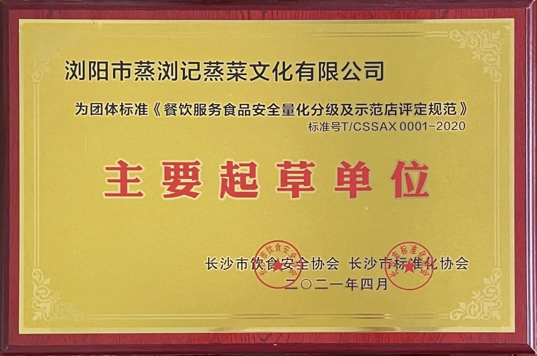 2020年底,湖南發布《餐飲服務食品安全量化分級及示范店評定規范》團體標準。蒸瀏記是這一團體標準的主要起草單位,得到了長沙市飲食安全協會的表彰。