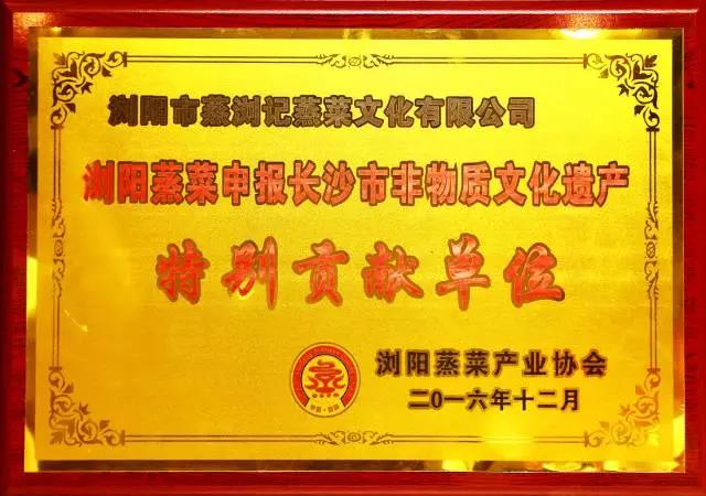 2月15日,2017長沙市非遺保護和傳承座談會召開,會上,瀏陽蒸菜傳統制作技藝等24項新入選的第五批市級非物質文化遺產代表性項目被授牌,瀏陽蒸菜產業協會會長彭成將牌匾領回瀏陽,蒸瀏記被授予本次非物質文化遺產申報的特別貢獻單位。